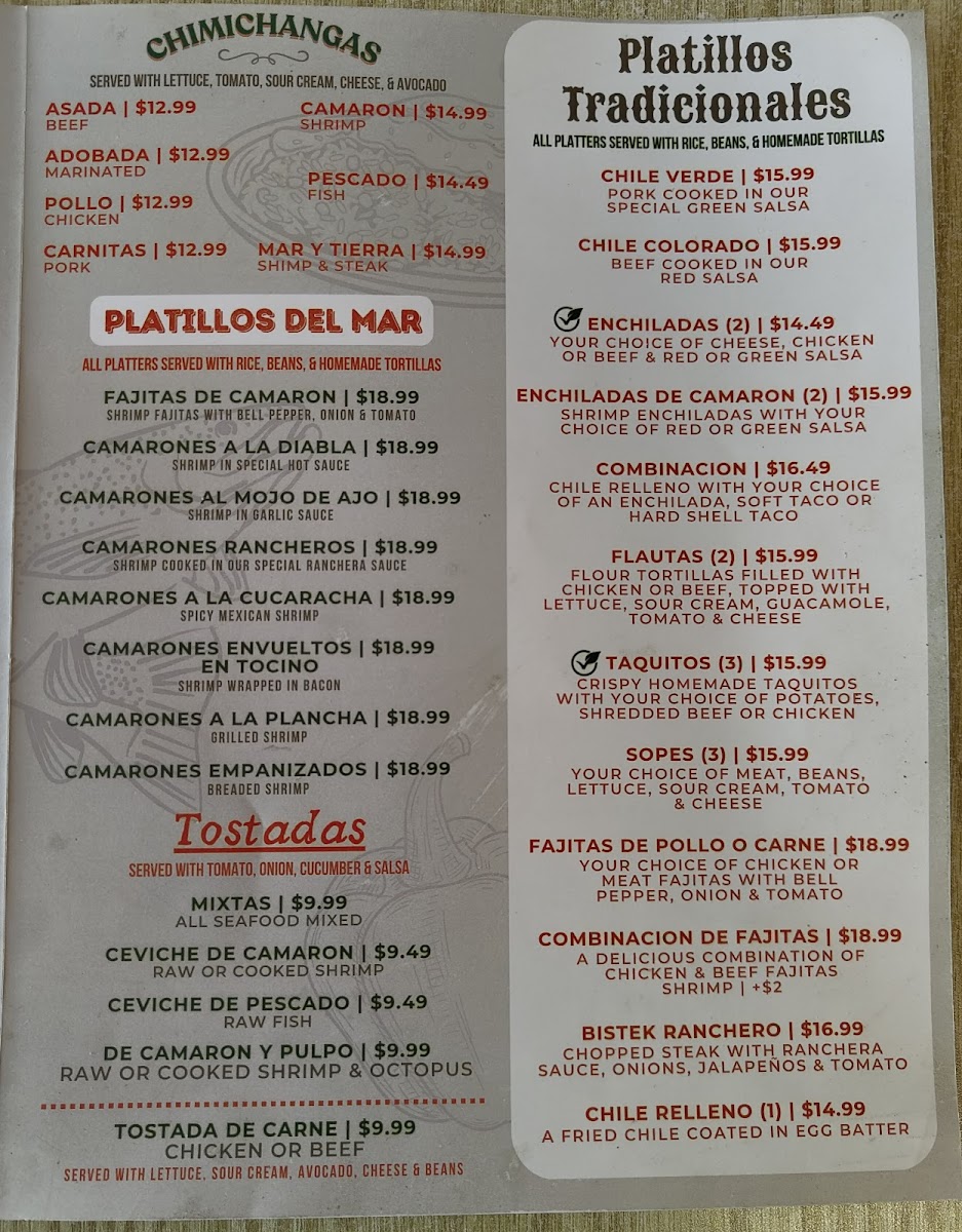 The menu highlights include well-loved items such as Tacos Al Pastor, Carnitas, and seafood specialties like Shrimp Empanadas and Camarones a La Diabla. Many dishes carry a home-style authenticity that pairs naturally with the relaxed, mom-and-pop atmosphere of the restaurant.