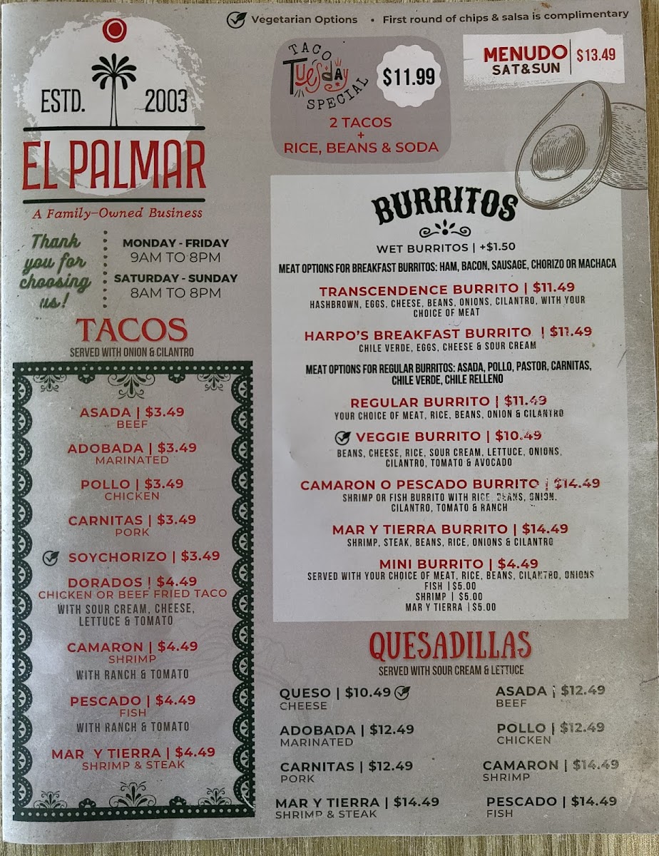 Mariscos El Palmar offers a straightforward and inviting menu focused on traditional Mexican fare with an emphasis on fresh seafood and comforting classics. The selection is perfect for casual meals throughout the day, from hearty breakfasts featuring chilaquiles and huevos rancheros, to flavorful tacos and sizable burritos enjoyed during lunch or dinner.